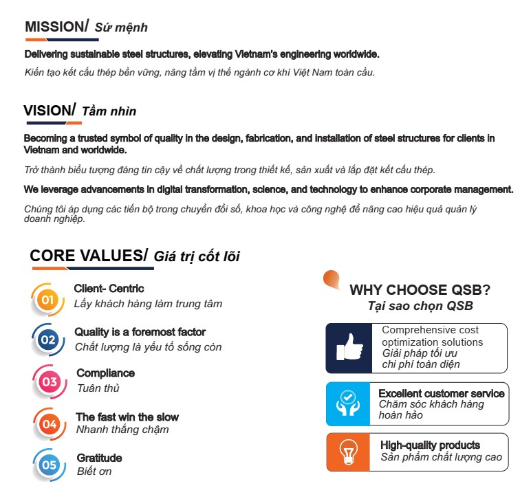 Với tinh thần luôn học hỏi, trách nhiệm trong công việc và tiếp thu những cái tốt hơn, QSB Steel mong muốn mang đến sản phẩm tốt nhất cho mọi khách hàng, đáp ứng hoàn toàn các yêu cầu trong từng dự án. Chúng tôi hoạt động theo phương châm "Chất lượng tốt nhất- Giải pháp hàng đầu”, sự hài lòng và niềm tin của khách hàng chính là thành công của QSB, đó là nguồn động lực rất lớn để chúng tôi tiếp tục mang sản phẩm tốt nhất vươn xa trên toàn thế giới.